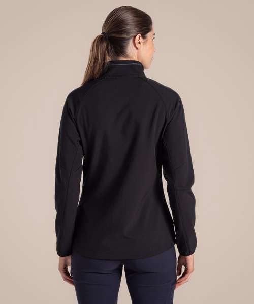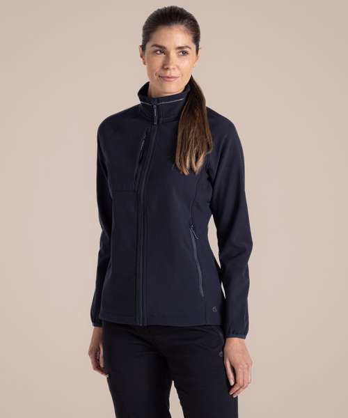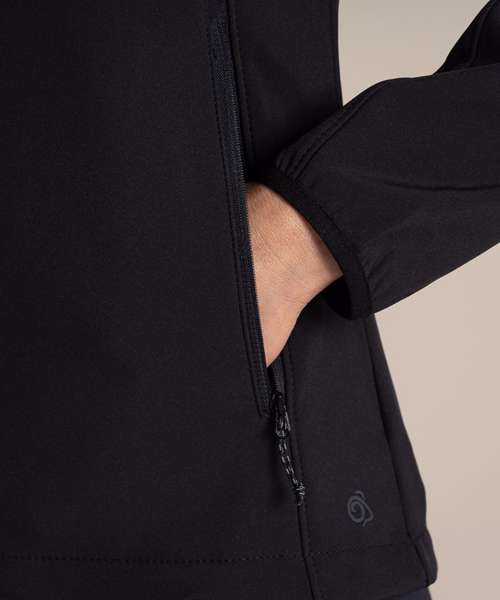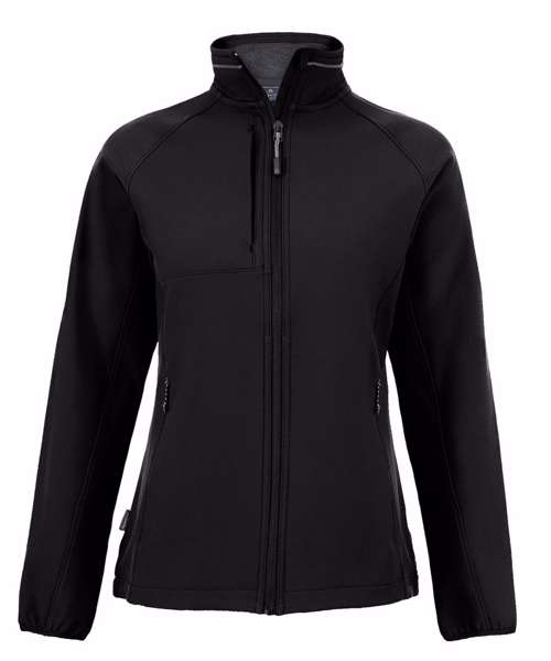Water-resistant and windproof softshell jacket with 3 pockets. Recycled polyester elastane softshell with EcoShield DWR finish. Striped microfleece back and recycled zip tapes.